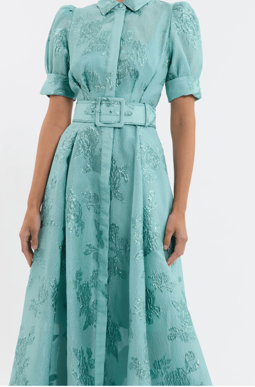 A striking floor-length gown in a soft green tone with a subtle metallic floral texture throughout. Designed with a structured collar, short sleeves and a matching belt to define the waist, it flows into an elegant full skirt with beautiful movement. A refined, high-end choice for weddings, race days, communions and formal family occasions. Fits true to size. Also available in pink in size 10
