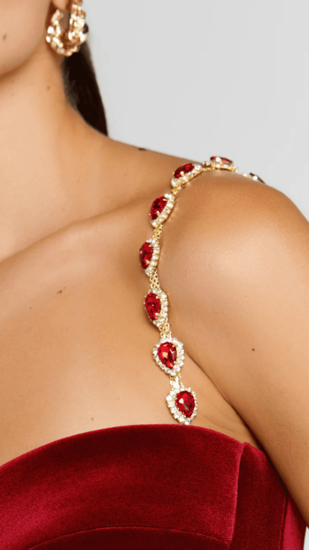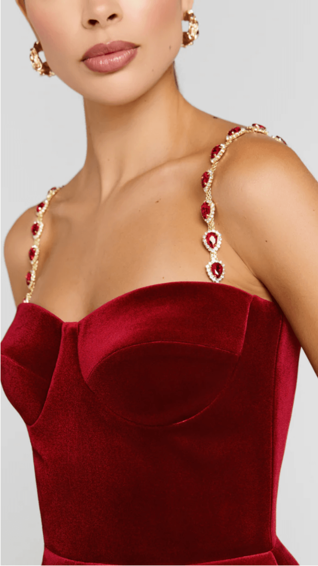 This stunning Velvet Mini Dress brings modern glamour to a timeless silhouette. Designed in rich red velvet, it features a structured corset-style bodice with boning for a sculpted fit and a signature tulip mini skirt that flatters the figure. Detachable gold straps adorned with red jewels add a touch of luxe versatility. Size S/M (10) Fits true to size.