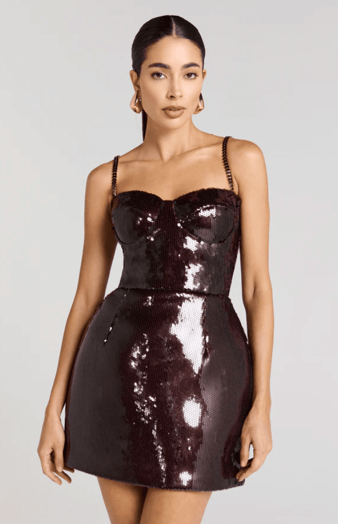 Shimmer in this chocolate brown mini, featuring a structured bodice with internal boning for a flattering fit. The signature tulip-style skirt adds a playful touch, while detachable jewelled straps let you switch up the look.