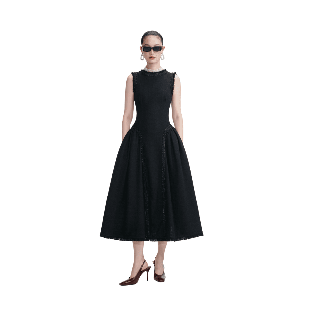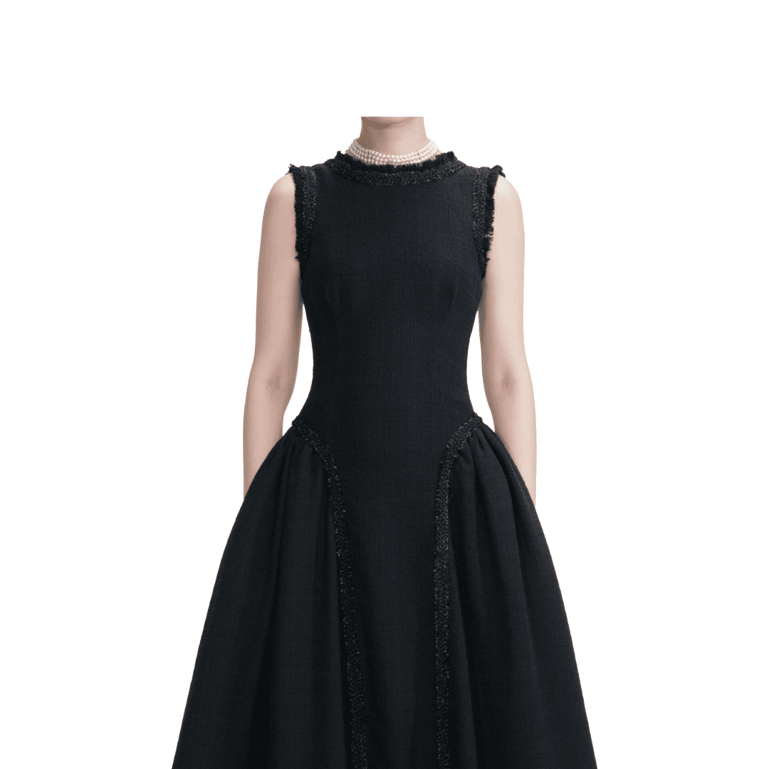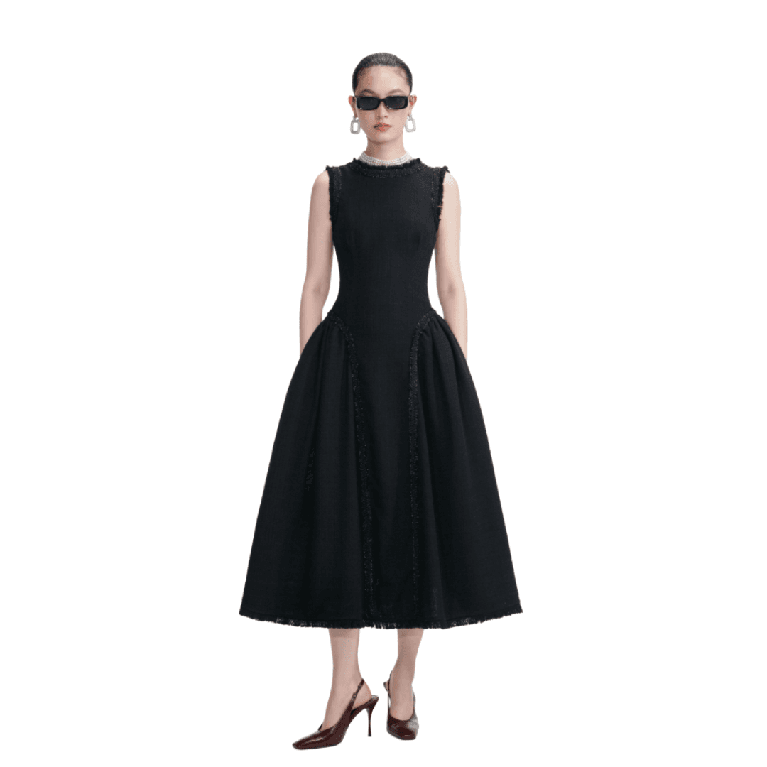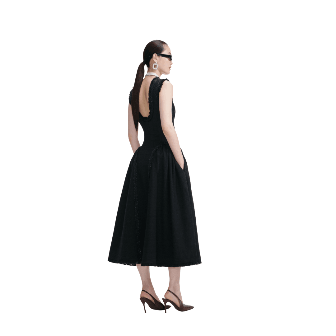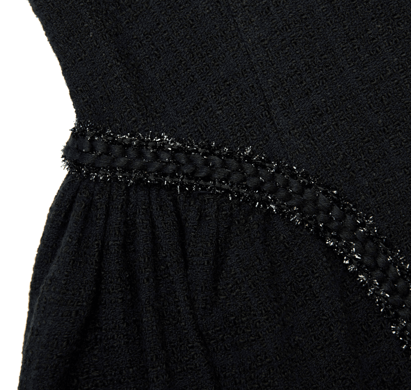 This black dress captures the spirit of Chanel’s timeless elegance and the iconic grace of Breakfast at Tiffany’s. With a sculpted bodice, refined textured trims, and a sweeping mid-calf skirt, it offers effortless sophistication for any occasion that calls for classic glamour. Crafted in boucle fabric with shimmering trim, truly a stunning piece. Fits true to size.