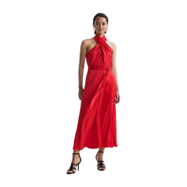 Made from a beautiful heavy weight satin with a smooth, subtle sheen. This dress has a halter neckline with an asymmetric, one-shoulder detail and a clean, sleeveless cut. The self-tie waistbelt allows for an adjustable fit. Fits true to size.