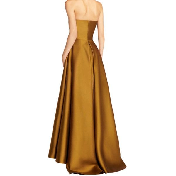 The Tiffany Maxi Dress by Solace London in a stunning gold satin-twill. This floor-length gown features a chic bandeau neckline and pleated detailing at the sides, creating a striking and sophisticated silhouette. Perfect for making an elegant statement at any formal event. Fits size 12-14.